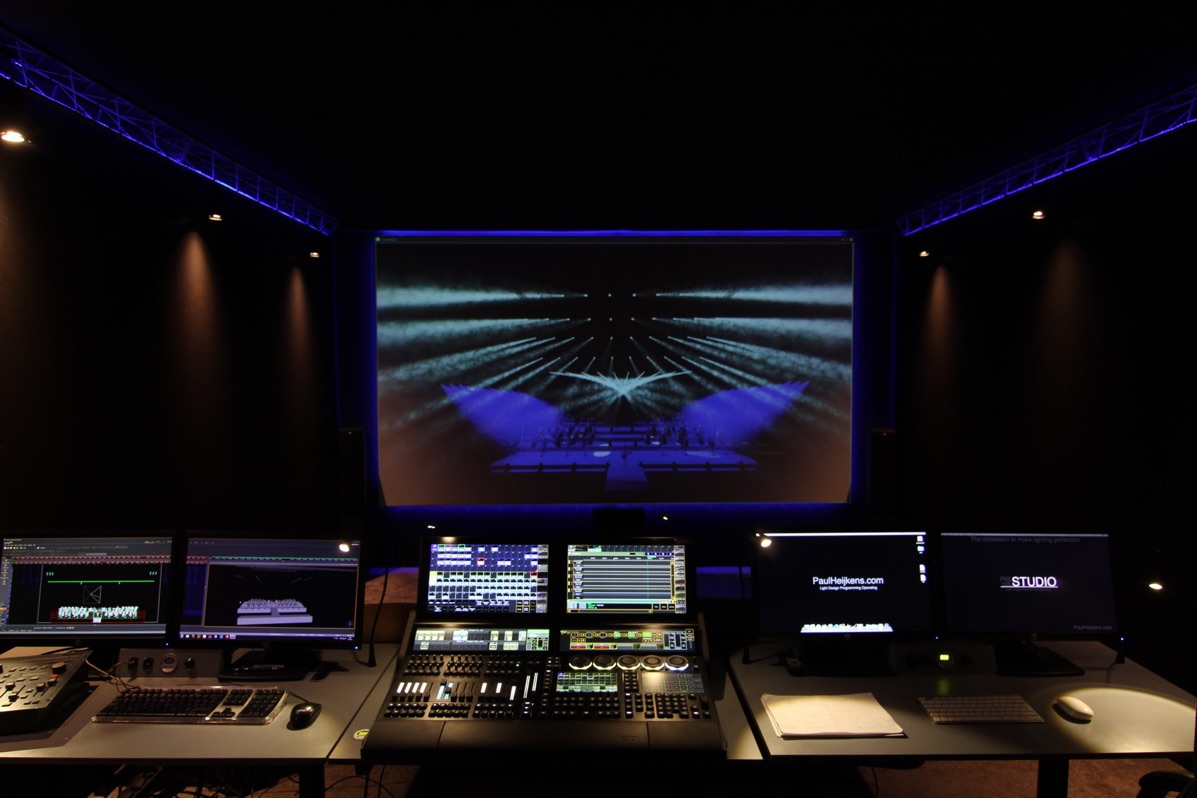 And on the right side space for working on media servers and timecode timelines. All the desk’s are on wheel’s and electric adjustable in height for high flexibility of the space.